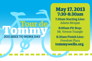 Celebrate Bike to Work Day 2013 on May 17th with Tour de Tommy! Join us as we cycle from pit stop to pit stop across the city, starting in Adams Morgan and ending at Freedom Plaza. Come for the whole ride, jump in at any of the pit stops, or catch up with us along the route. Please wear your helmet!