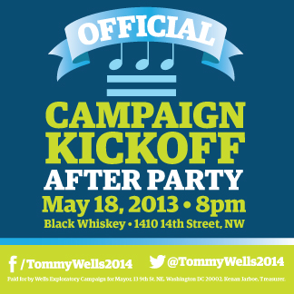 Join Tommy Wells and fellow supporters for the official Campaign Kickoff After Party at 8pm on Saturday, May 18. The party is at one of DC's newest music venues, Black Whiskey, 1410 14th Street, NW. Tommy to introduce The Delegation at 11pm.